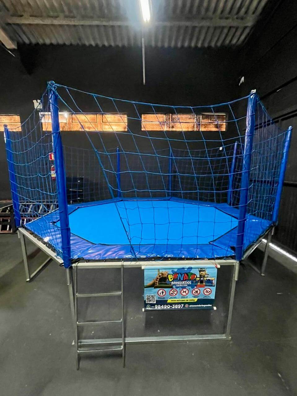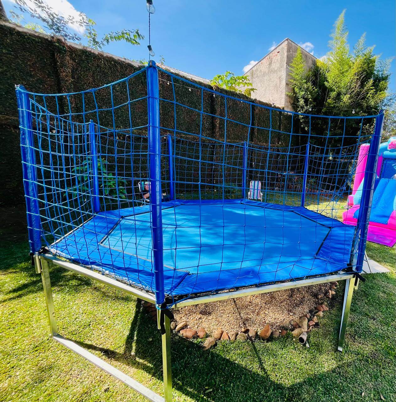Uma cama elástica toda azul, com design moderno e visual incrível, que garante saltos seguros e muita alegria para a criançada!